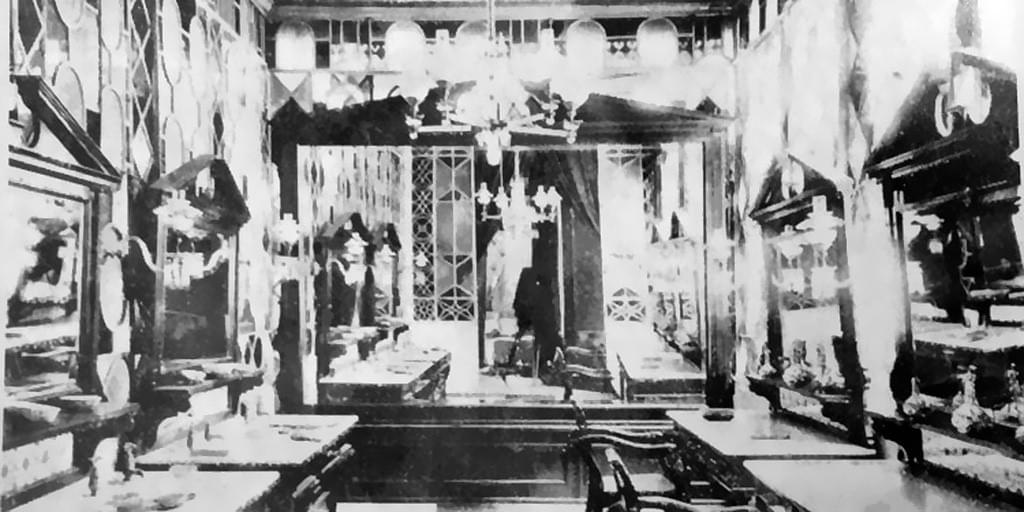 El escritorio de D. Matías Errázuriz, hállase decorado con recuadros de madera y fondo de terciopelo carmesí.