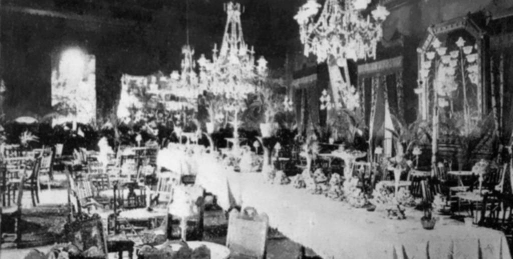 Las aristocráticas arañas de cristal, penden de la techumbre blanca. Blancas son también las paredes, adornadas con espejos, brazos de luz y ornamentaciones de oro patinado.
