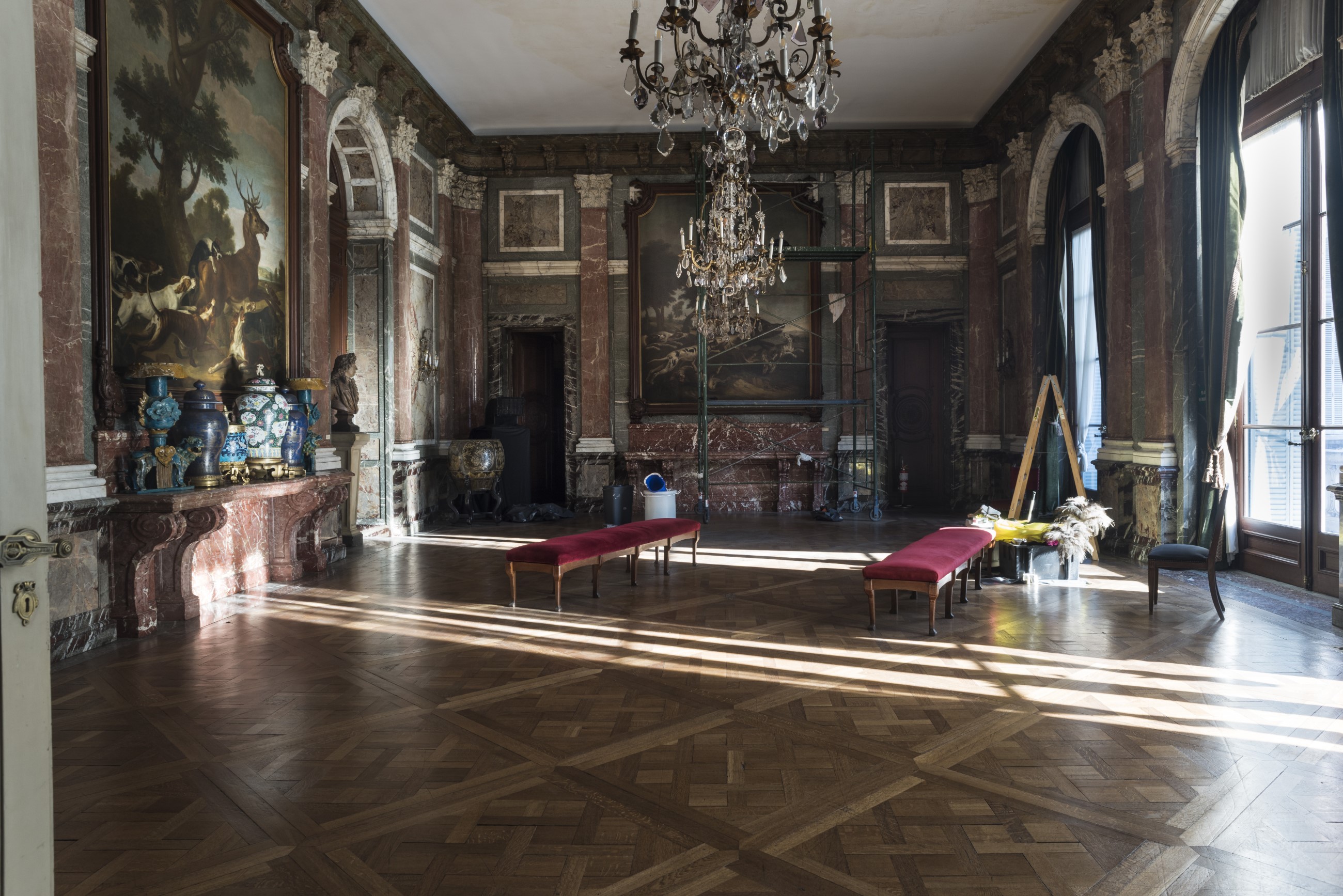 Este salón, del más refinado buen gusto, evoca por su ambiente característico, aquella época suntuosa en que la corte de París ostentaba los esplendores decadentes de la Regencia en la menor edad del rey Luis XV.
